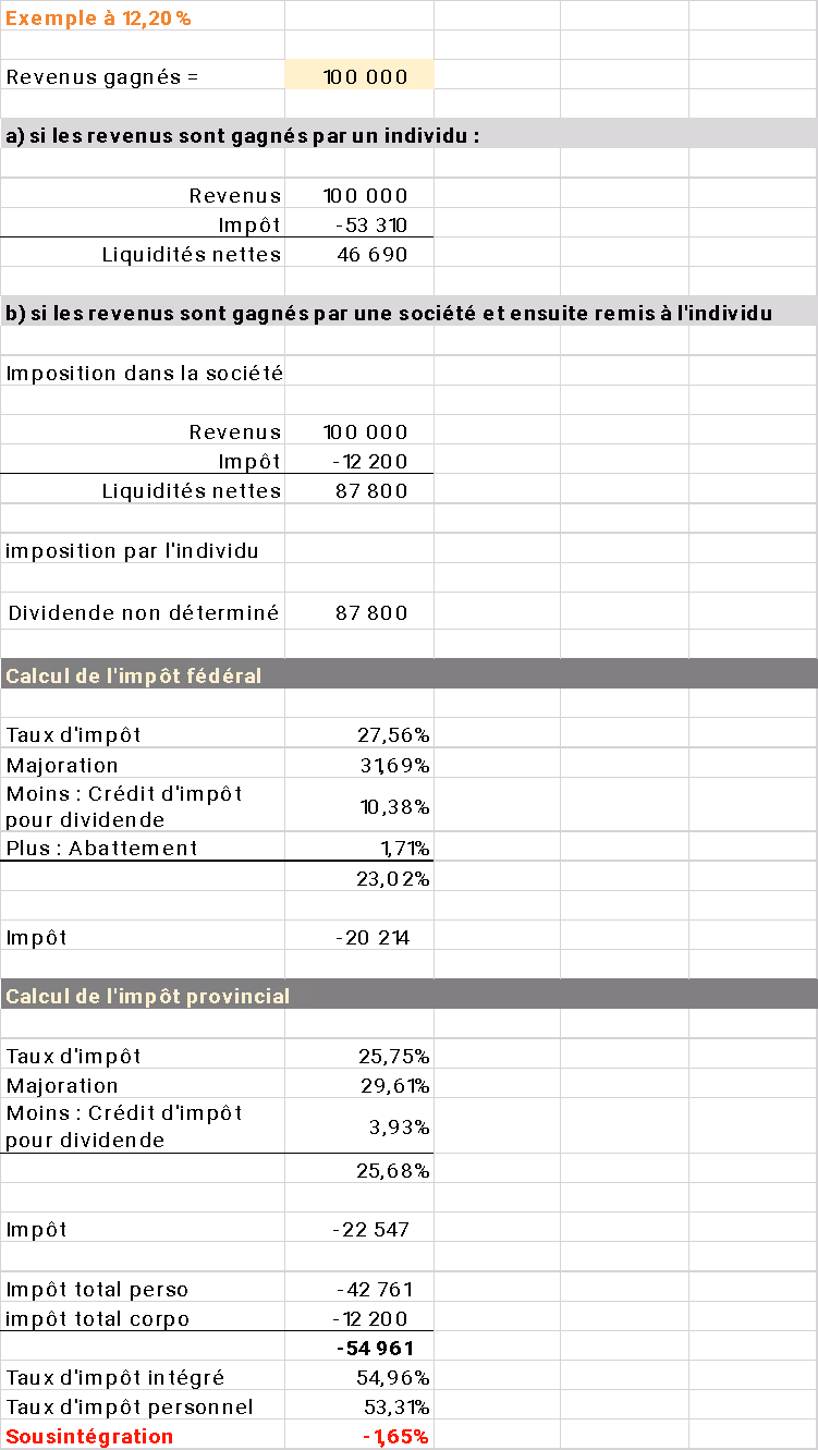 Néanmoins, il est bon de noter qu’une intégration « imparfaite » pourrait être à votre avantage, même si la chose n’arrive pratiquement jamais. On parlera alors de « surintégration », et il s’agit du phénomène où le total des impôts payés par la société et le particulier (actionnaire) est inférieur à celui qui serait payé par un particulier qui recevrait un salaire ou une prime.